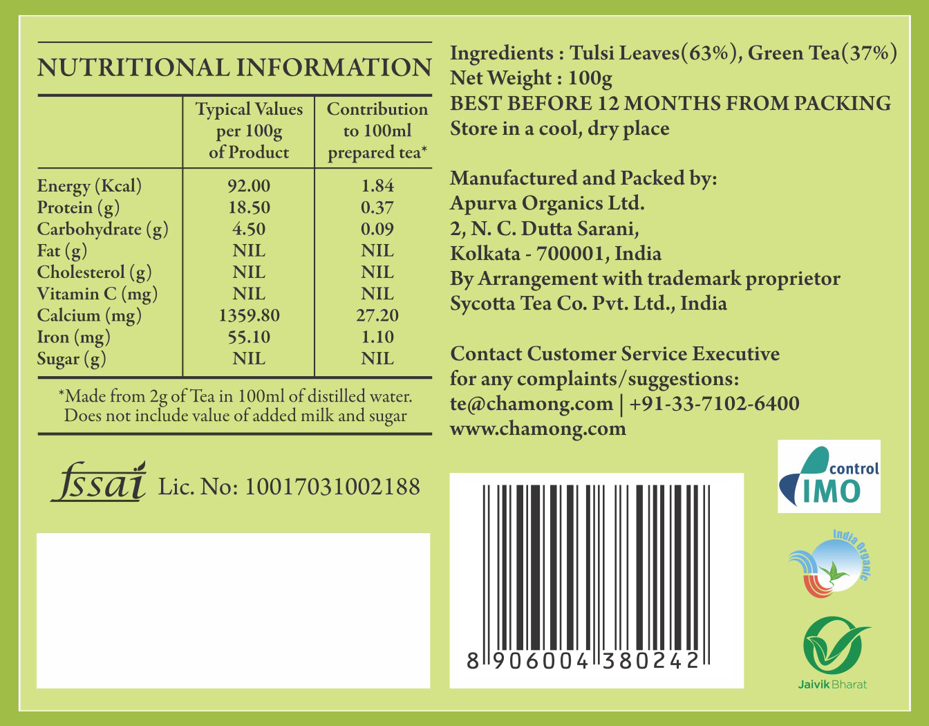 Brewing Instructions: Add a teaspoonful of Chamong Tulsi Green Tea to freshly boiled 180 ml water, let it steep for 3 to 4 minutes and strain.