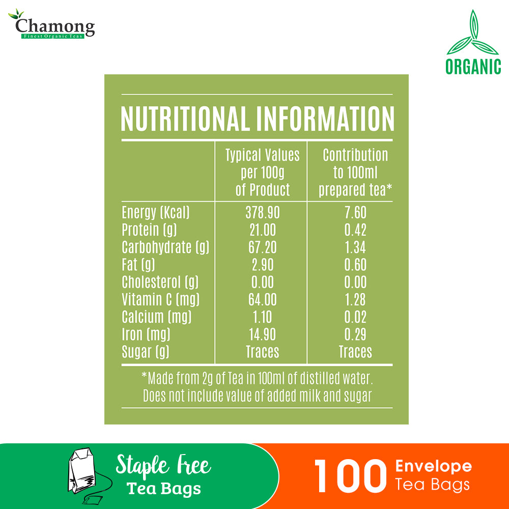 Brewing Instruction: Place a Chamong Green Tea Bag in a cup, pour freshly boiled 180 ml water over it and let it rest for 3 minutes. Remove the tea bag and serve.